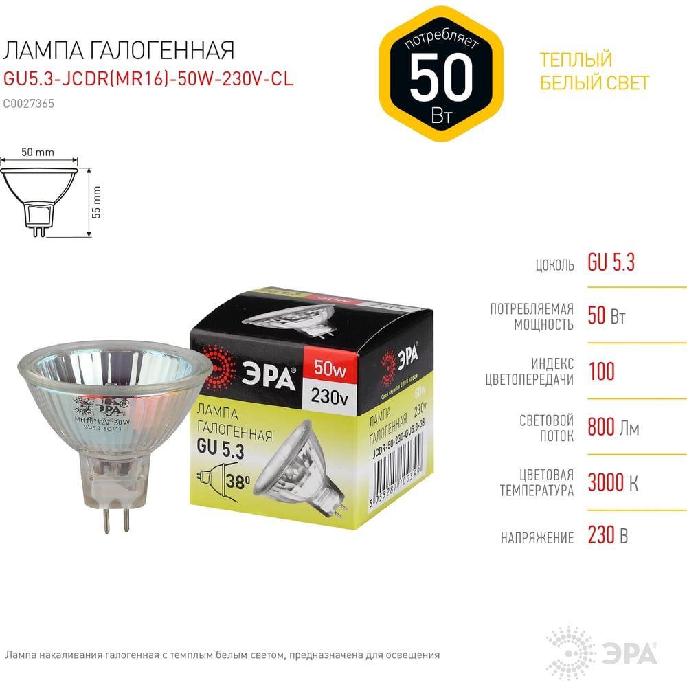 Лампа галогенная GU5.3-JCDR (MR16) -50W-230V-Cl ЭРА C0027365
