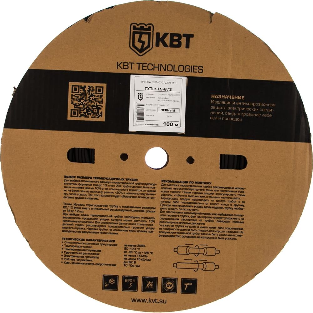 • Предназначены для изоляции и антикоррозионной защиты электрических соединений, бандажирования кабелей и проводов • Форма поставки: рулон • Коэффициент усадки: 2:1 • Материал: полиолефин, не поддерживает горение • Цвет: черный • Обладают устойчивостью к воздействию ультрафиолетового излучения • Инструмент для монтажа: высокотемпературный фен ТТ-1800 или портативные бутановые горелки "КВТ" Описание и особенности продукта Трубки ТУТнг – стандартные высококачественные термоусадочные трубки с коэффициентом усадки 2:1, не поддерживающие горение (самозатухающие). Изготовлены из специальной композиции полиолефинов с добавлением нетоксичных антипиренов. Характерной особенностью данного вида термоусаживаемых трубок производства "КВТ" является выверенная равномерная толщина стенок, что достигается благодаря тщательному контролю технологических процессов экструзии и раздувки. Кроме того, в отличие от термоусадочных трубок китайского производства, широко представленных на российском рынке, толщина трубок ТУТнг от "КВТ" значительно больше, чем у низкокачественных бюджетных аналогов. Высокие требования к изолирующим свойствам и надежности продукции всегда отличали термоусадочные изделия торговой марки "КВТ". Термоусадочная трубка ТУТнг (КВТ) является негорючей, дружелюбной к окружающей среде (environment friendly) и безвредной для человека. В составе трубок присутствуют вещества замедляющие горение. Завод КВТ был первым в стране производством, разработавшим специальную композицию, в результате чего, к привычной аббревиатуре ТУТ (ТермоУсаживаемые Трубки) был добавлен индекс негорючести "нг". Трубки ТУТнг (КВТ) обладают выраженными свойствами замедления горения и рекомендованы для монтажа на современных проводах и кабелях с самозатухающей изоляцией (с индексами "нг" и "нг-LS"). Низкий порог температуры усадки (90°) обеспечивает скорость и удобство монтажа. Материал трубок устойчив к ультрафиолетовому излучению и погодным условиям. Трубки ТУТнг (КВТ) поставляются в бобинах и идеально подходят для промышленного применения, предполагая нарезку под требуемый размер по месту монтажа. Линейка типоразмеров представлена широким размерным рядом и гаммой из 7 стандартных цветов ( черный, красный, желтый, синий, зеленый, белый и желто-зеленый). Под заказ возможно исполнение трубок нестандартных цветов. Мелкие трубки, до размера 6/3мм включительно имеют круглый профиль поставки, а трубки диаметром 8/4мм и более – плоский профиль. Термоусадочные трубки черного цвета представлены наиболее широким диапазоном размеров от 2/1 до 120/60мм. А диаметры цветной трубки варьируются от 4 до 60мм, что позволяет подобрать термоусадку для любых проводов. Трубки ТУТнг производства "КВТ" многие годы успешно применяются в различных сферах отечественной промышленности, при выполнении электромонтажных работ, ремонте бытовой, авто и мототехники, для маркировки и бандажирования проводов, антикоррозионной защиты контактных электрических соединений и в декоративных целях.