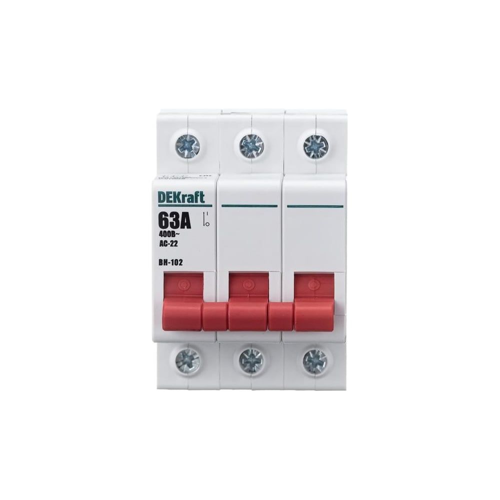 Выключатель-разъединитель серии ВН-102 DEKraft; 3P; номинальный ток 63 А; установка – на DIN-рейку; установочное положение - любое. Выключатели-разъединители применяются для ручного включения/отключения сетей напряжением до 400 В. Специальные мостиковые контакты обеспечивают надежный разрыв цепи; они полностью исключают возможность перекрытия дугой по изоляции. Усиленная рукоятка управления обеспечивает большое количество включений/отключений.